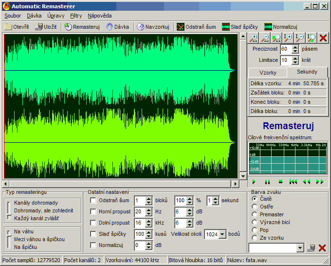 Program používá pro všechny výpočty vnitřně 32 bitovou reprezentaci zvuku, což zaručuje dynamiku 240 dB v pevné desetinné čárce a až 1667 dB v pohyblivé řádové čárce. Toto zaručuje po zpětném převedení na výstupní 16 bitový formát neměřitelné výpočetní ztráty. Rovněž frekvenční zpracování pomocí FFT (Fast Fourier Transformation) o velikosti bloku 16384 samplů na kanál zaručuje vysokou frekvenční přesnost. Metoda autodetekce šumu vyžaduje aby v nahrávce existovalo alespoň jedno místo pouze s šumem o délce alespoň jedné sekundy, jinak může dojít k odstranění i jiných tonů, než šumu a tak k poškození nahrávky. Bohužel si nejsem vědom toho, že v současné době existuje metoda detekce šumu ze vzorku, kde se nenachází v žádném místě šum v čisté podobě. Narozdíl od většiny ostatních programu alespoň není nutno šum ručně vyhledávat a označovat, program jej nalezne sám. Diky 32 bitovému zpracování nelze signál "přepálit", pokud špičky přesahují za hranice normalizovaného signálu, nejsou sice zobrazeny, ale po normalizaci signálu jsou zpět k dispozici nezkreslené. Pokud však vzorek uložíte s přesahem špiček, budou ořezány. |